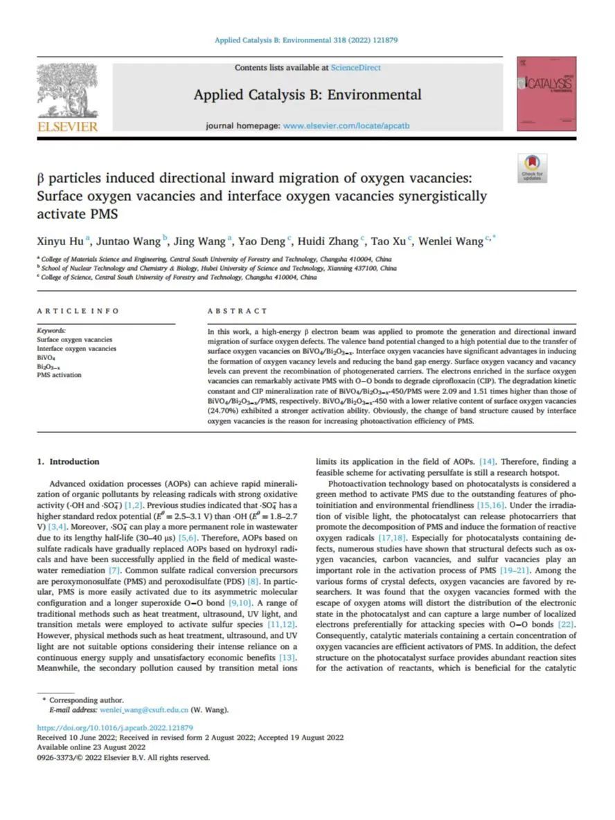 中南林业科技大学王文磊教授指导的2018级材料化学专业本科生胡新宇,以第一作者身份在国际顶级期刊《Applied Catalysis B: Environmental》(中科院一区TOP期刊,IF = 24.319)发表题为“β particles induced directional inward migration of oxygen vacancies: Surface oxygen vacancies and interfacial oxygen vacancies synergistically activate PMS”的最新研究成果。