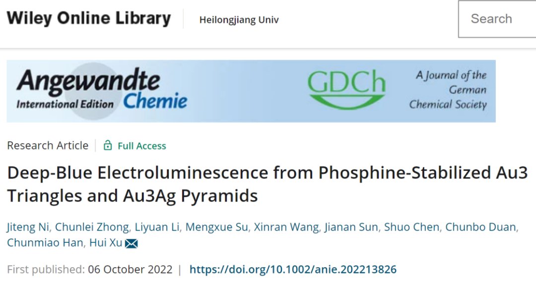 据微信公众号“黑龙江大学”消息,近日,国际顶级期刊《Angewandte Chemie International Edition(德国应用化学)》(中科院一区、top期刊,影响因子16.823)在线刊登了黑龙江大学化学化工与材料学院本科生项目(化学学科)团队关于“团簇电致发光材料及器件”的最新研究成果。
